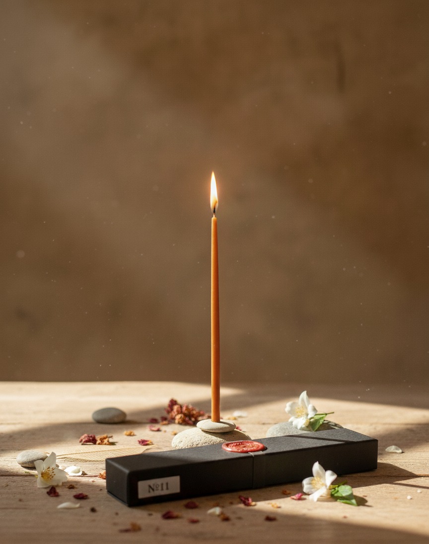 Set de 20 velas artesanales de cera de abeja pura con frecuencia Nº11, creadas para expresar gratitud, honrar los favores recibidos y fortalecer la conexión con la energía del bien.